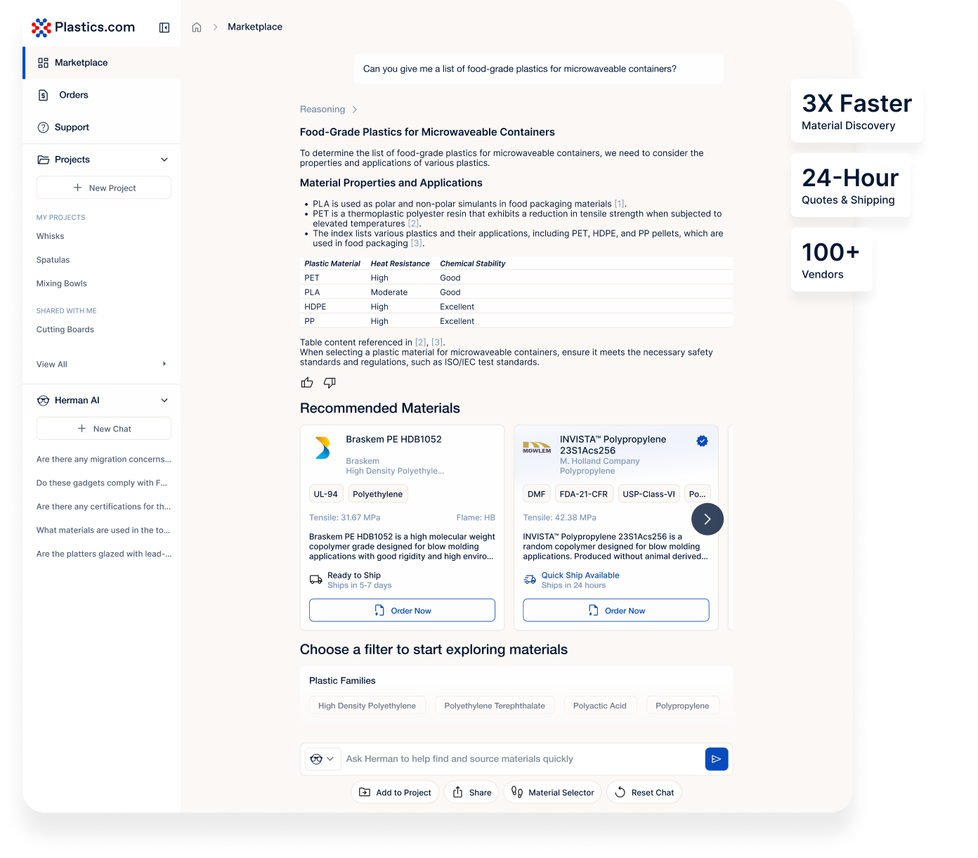 Chat to define requirements, ask technical questions, and get intelligent material recommendations across 40,000+ plastics.