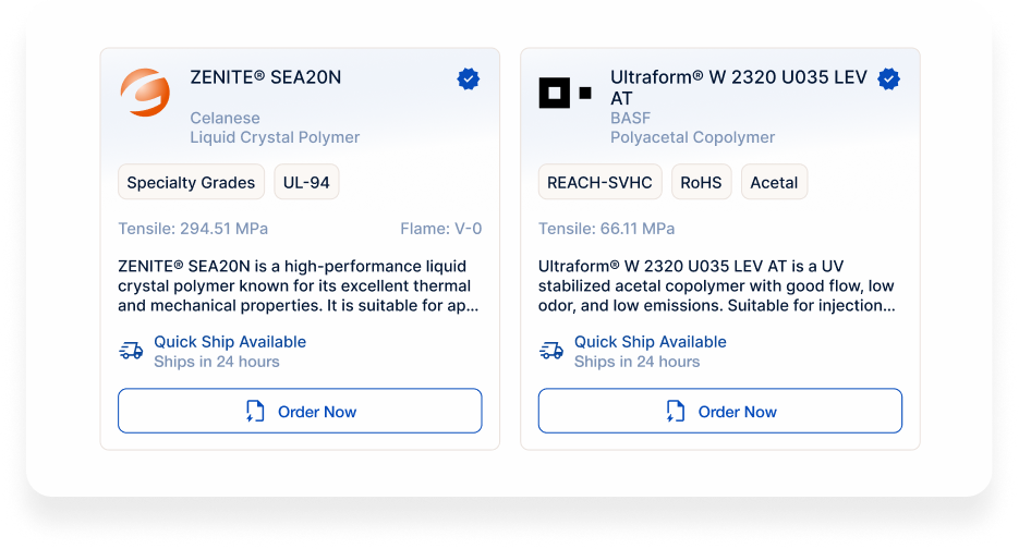 Plastics.com unifies material data, evaluation tools, a real-time marketplace, and engineering-grade AI—so your team can research, compare, decide, and order without switching between PDFs, portals, and spreadsheets.